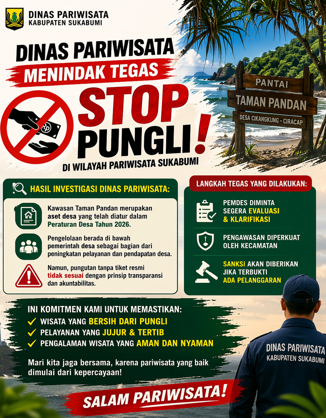 Langkah ini merupakan bagian dari upaya pemerintah daerah dalam menciptakan ekosistem pariwisata yang bersih, tertib, dan berintegritas. Dinas Pariwisata juga mengajak seluruh elemen masyarakat untuk bersama-sama menjaga kepercayaan publik terhadap destinasi wisata di Sukabumi.