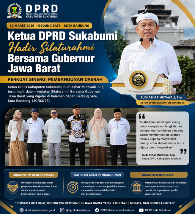 aliansisukabuminews.com – Sukabumi, Ketua DPRD Kabupaten Sukabumi, Budi Azhar Mutawali, S.Ip, turut menghadiri kegiatan silaturahmi bersama Gubernur Jawa Barat yang digelar di halaman depan Gedung Sate, Kota Bandung, pada Senin (30/03/2026).